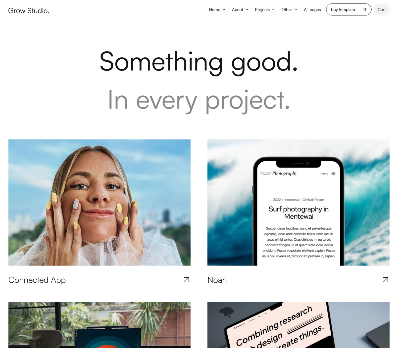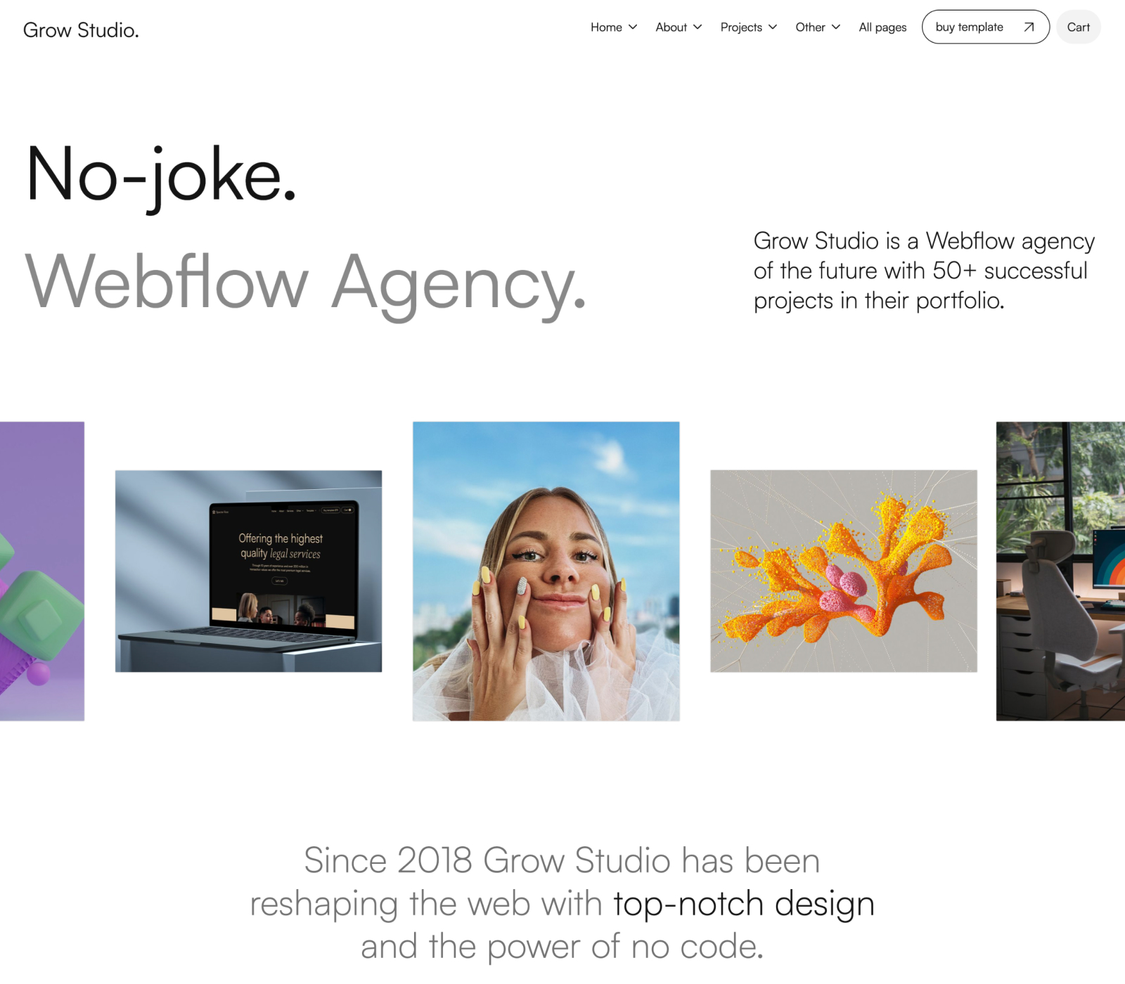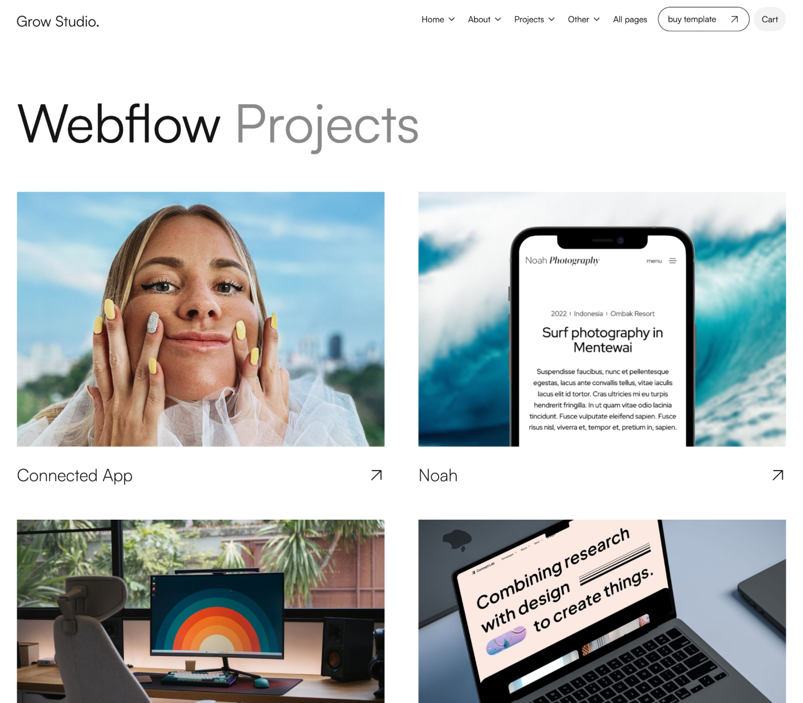 Grow Studio includes a projects, project service, careers and blog collections that are made on the powerful Webflow CMS. This will let you add new content extremely easily.